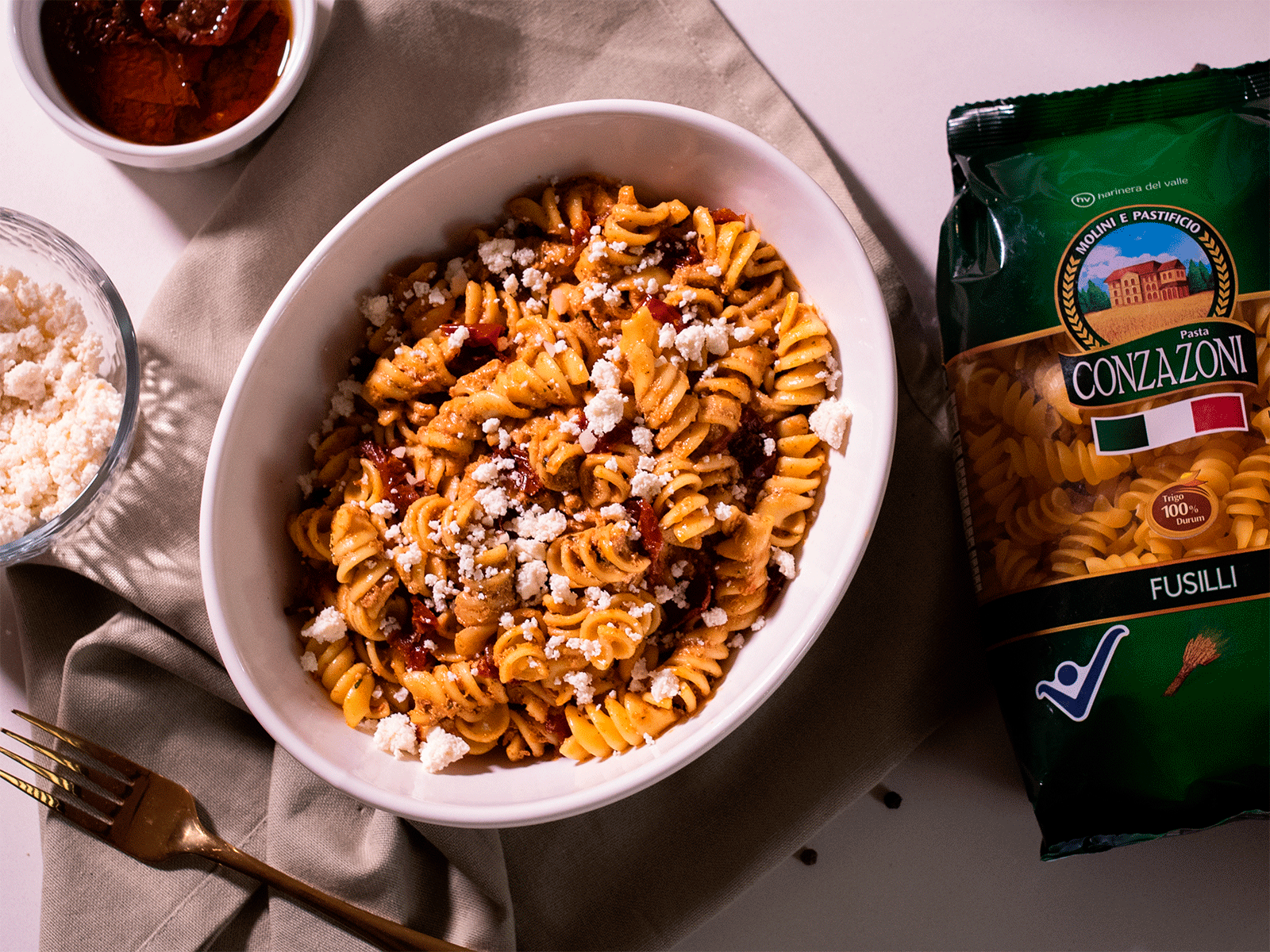 Fusilli con pesto de tomate y rúgula